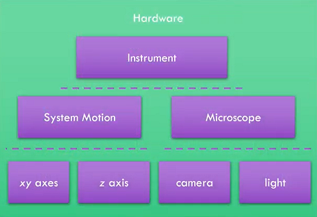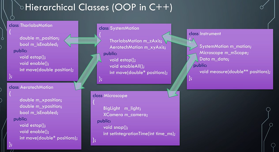 By extension, if we not only encapsulate the relevant data, but also the relevant functionality in the hierarchy, we have what is called a Class in C++!. This logic strategy is called Object Oriented Programing. The figure below demonstrates how a microscope’s functions and variables can be managed using an OOP approach.